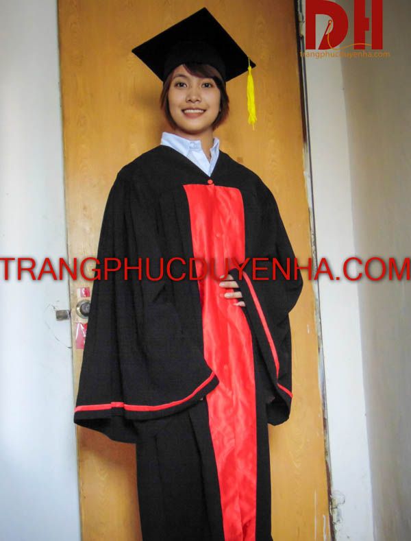 Áo cử nhân đại học mẫu CNSV025 có màu xanh tím than phối đỏ. Khi mặc áo tốt nhất kèm với áo sơ mi trắng để tăng tính trang trọng của trang phục.