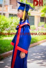 Áo tốt nghiệp cấp 1 mẫu CNTH010 có màu xanh dương phối đỏ Áo chui đầu, có mở cúc phía sau lưng Cổ áo thiết kế hình lá sen hài hoà. Nẹp áo màu đỏ chạy song song thân áo. Tay áo có viền đỏ.