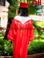 Áo cử nhân tiểu học CNTH014 có màu đỏ phối trắng Áo xẻ khoá giữa Ngực áo và sau lưng phối màu trắng rất hài hoà Áo có đi kèm với khăn trắng rời, quàng qua vai.