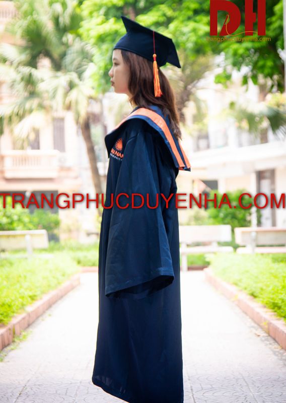 Áo cử nhân sinh viên mẫu CNSV020 là áo thụng với phần cổ áo phối màu xanh tím than và màu cam.