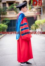 Lễ phục trao bằng mẫu LPTB001 có dáng thụng. Áo có xếp ly cầu kỳ ở ngực và lưng áo. Tay áo bo chun. Hai bên tay có 3 vạch. Khăn choàng dài phối màu xanh lé vàng. Mũ có 5 cạnh đặc trưng.